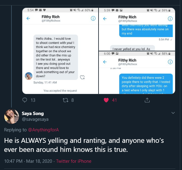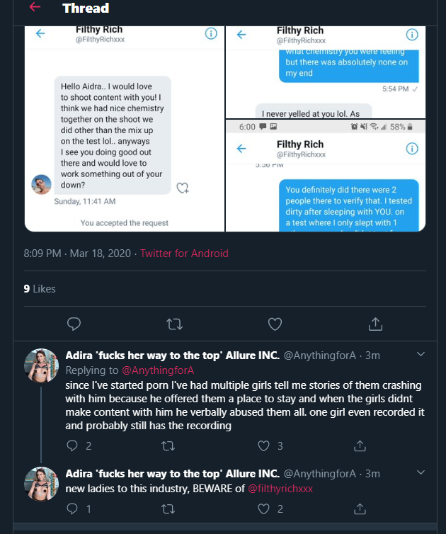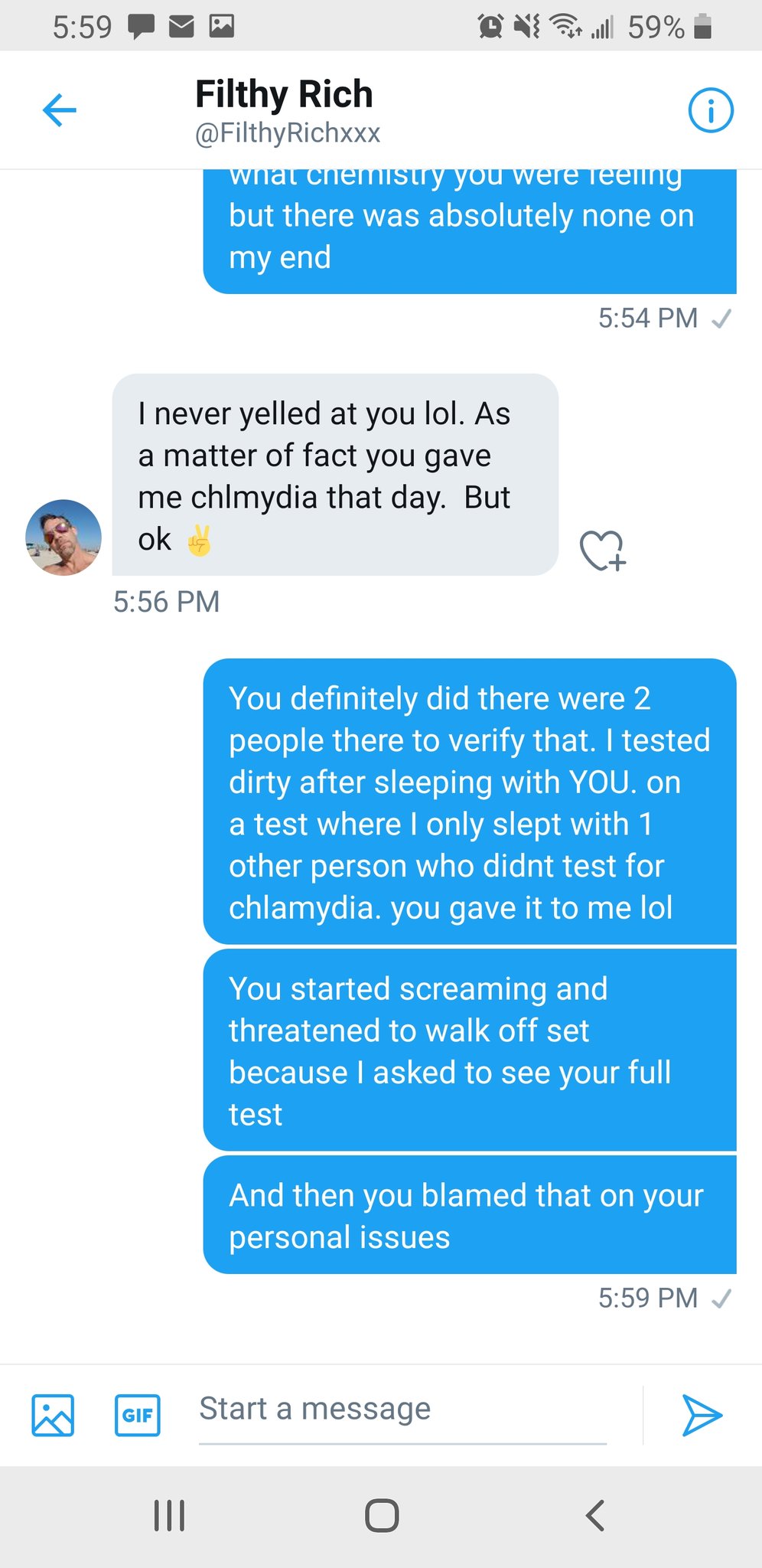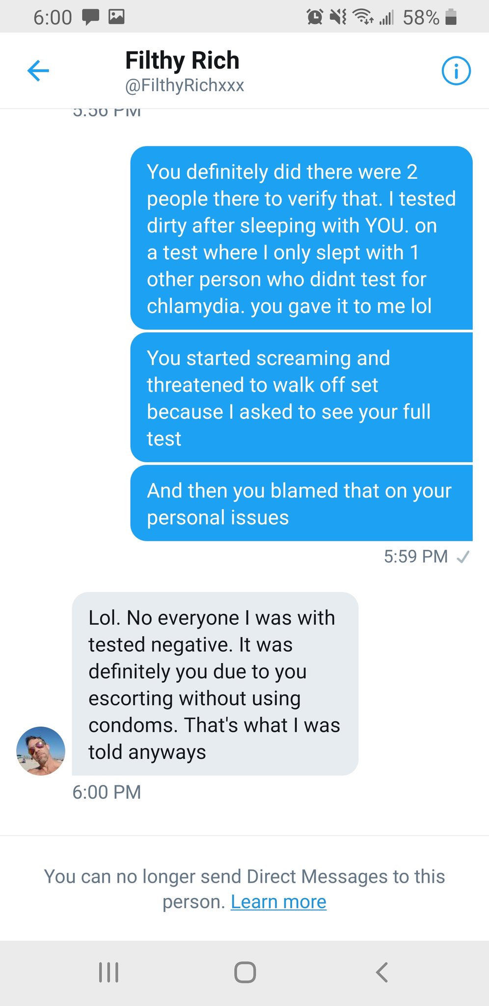 I know I should probably keep my mouth closed but this guy is a scum bag and I feel like Its my duty as a performer to warn new girls. to clarify while I did escort at this time, I never did it without condoms and besides this one time I’ve never popped dirty on a test. new ladies to this industry, BEWARE of @filthyrichxxx