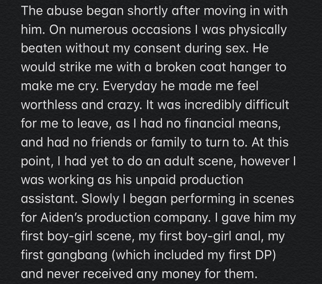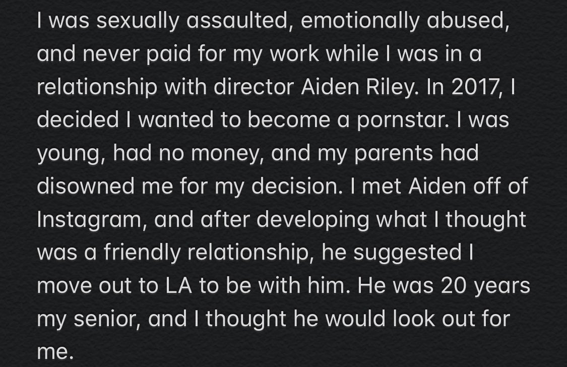 I was sexually assaulted, emotionally abused, and never paid for my work while I was in a relationship with director Aiden Riley. In 2017, I decided I wanted to become a pornstar. I was young, had no money, and my parents had disowned me for my decision. I met Aiden off of Instagram, and after developing what I thought was a friendly relationship, he suggested I move out of LA to be with him.