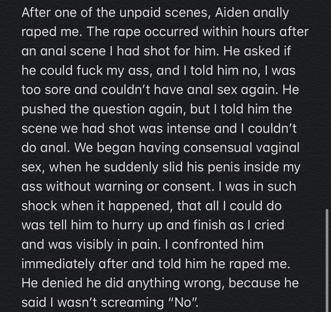 After one of the unpaid scenes, Aiden anally raped me. The rape occurred within hours after an anal scene I had shot for him. He asked if he could muck my ass, and I told him no, I was too sore and couldn’t have anal sex again.