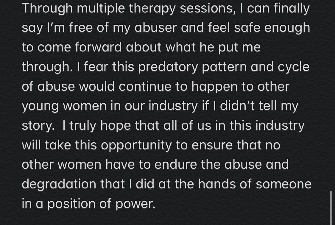 Through multiple therapy sessions, I can finally say I’m free of my abuser and feel safe enough to come forward about what he put me through. I fear this predatory pattern and cycle of abuse would continue to happen to other young women in our industry if I didn’t tell my story. I truly hope that all of us n this industry will take this opportunity to ensure that no other women have to endure the abuse and degradation that I did at the hands of someone in a position of power.